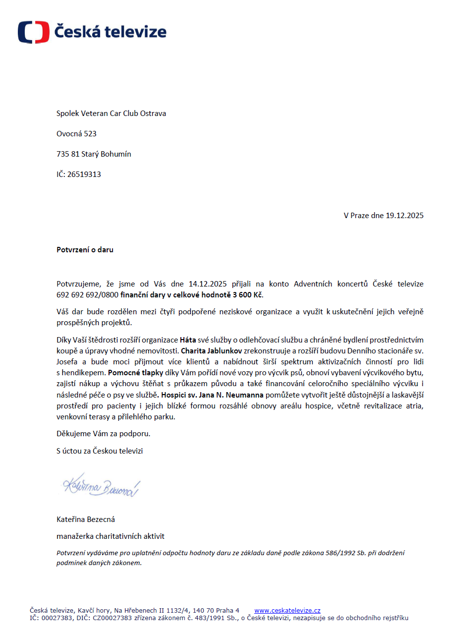 Jak jsme již avizovali dříve, tak jsme částku dne 14.12.2025 věnovali na dobrou věc v rámci Adventních koncertů České televize. Níže přikládáme potvrzení o daru.